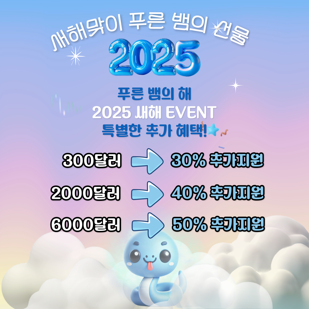 2025년 새해를 맞아 준비한 특별 이벤트를 소개합니다! 지금 증거금을 입금하시면, 입금액에 따라 최대 50%의 추가 지원을 받을 수 있는 절호의 기회입니다. 이번 이벤트는 전액 사비로 지원되는 혜택으로, 여러분의 성공적인 거래를 응원하는 마음을 담았습니다.