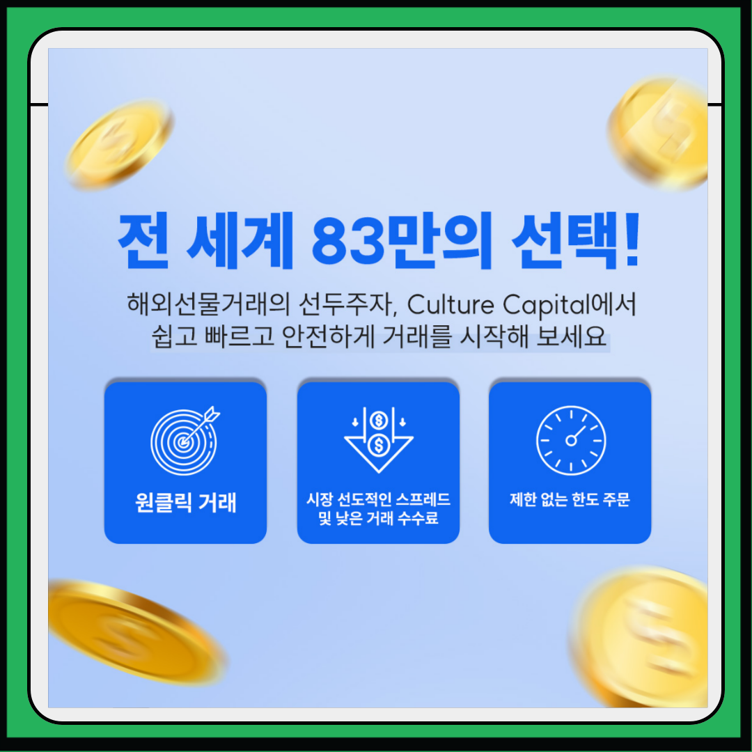 | ✅국내 최저 수수료 해외선물거래소, 컬쳐캐피탈의 매력 (1) | 2025.01.06 |