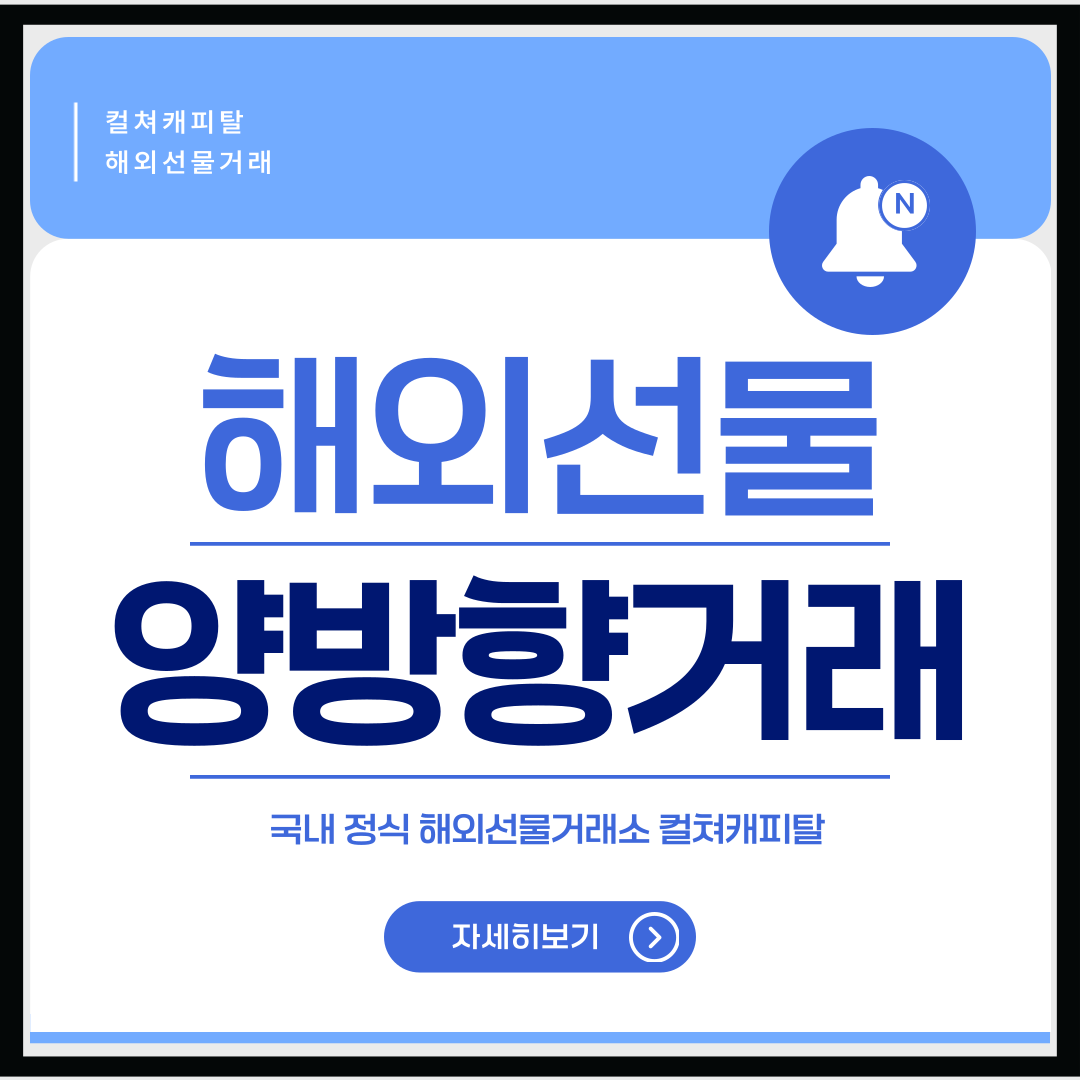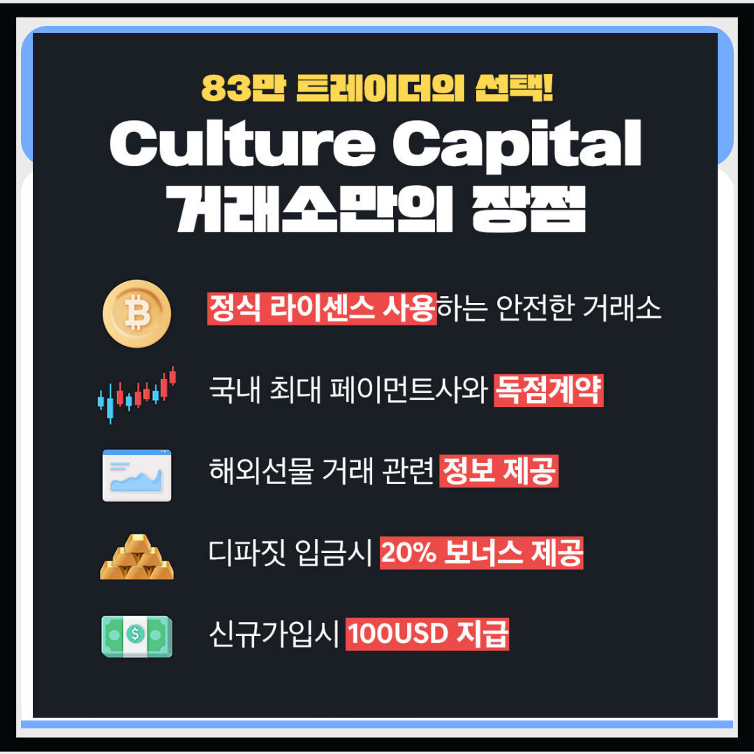 | ✅국내 정식 해외선물거래소, 컬쳐캐피탈! 자유로운 입출금과 다양한 혜택까지! 컬쳐캐피탈에서 하는 안전한 해외선물 (397) | 2025.04.01 |
