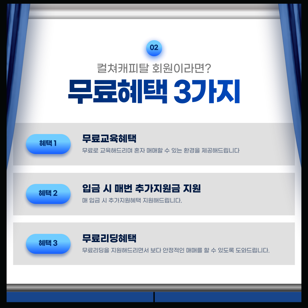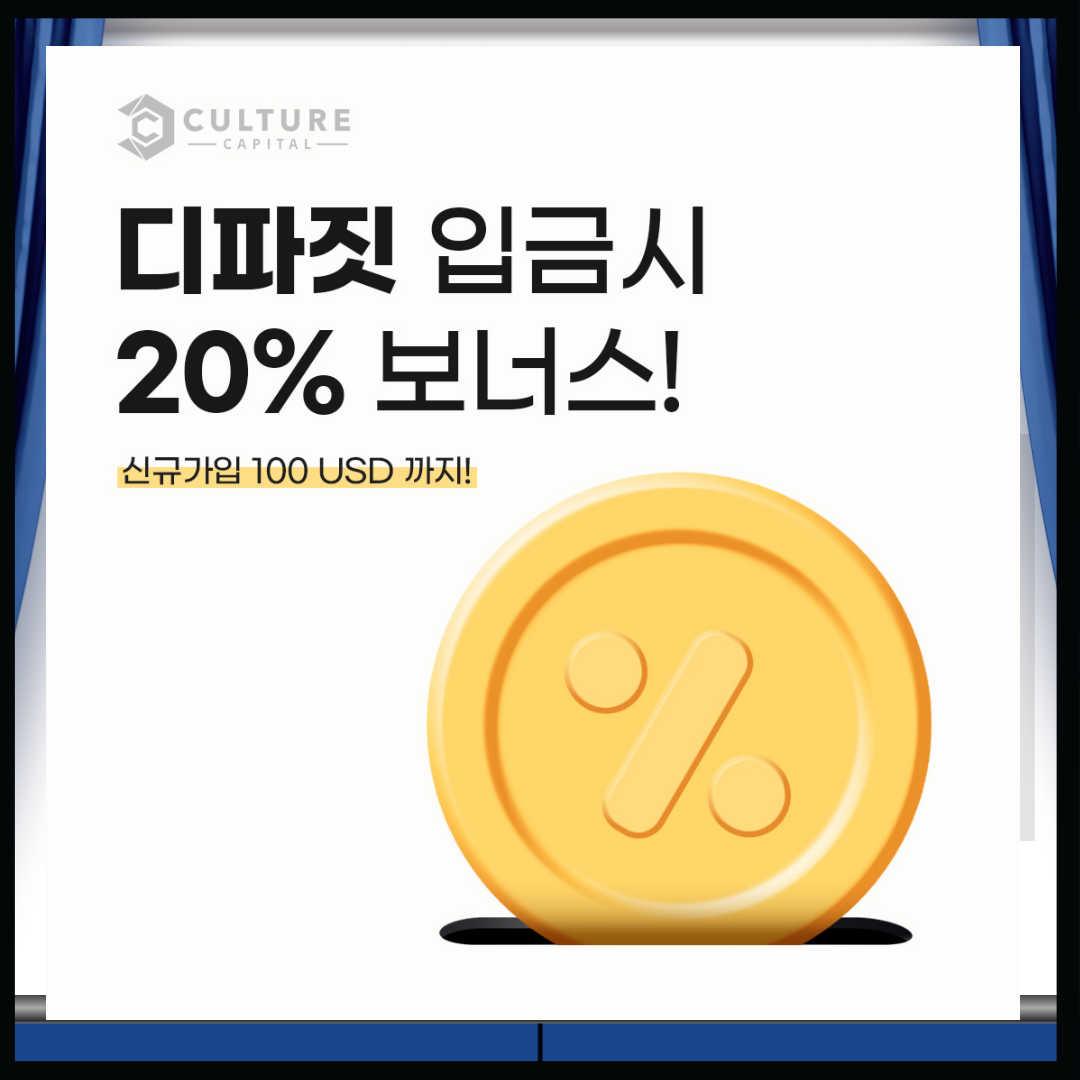 컬쳐캐피탈에 새롭게 가입하는 고객들을 위해 거래 지원금을 지급하는 이벤트를 진행 중입니다. 첫 입금 시 추가 보너스를 받을 수 있어 부담 없이 시작할 수 있습니다.