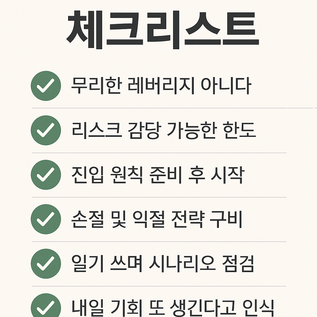 - 초보가 가장 많이 하는 실수는 레버리지 과다·무손절·추격매수입니다.