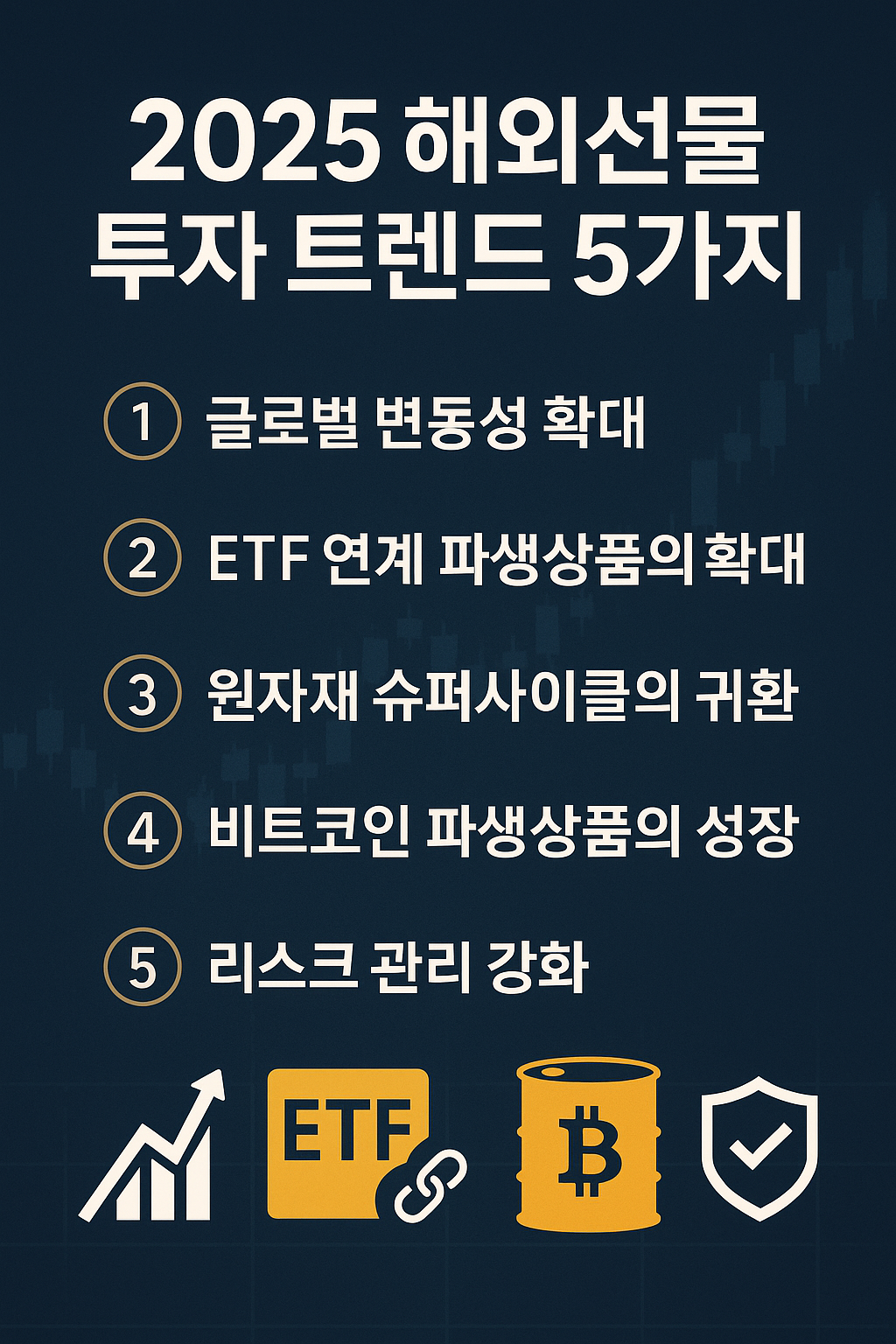 ✅ 2025년 해외선물 투자 전망은? 변동성 확대, ETF 연계, 원자재 슈퍼사이클, 비트코인 파생상품, 리스크 관리 강화까지.