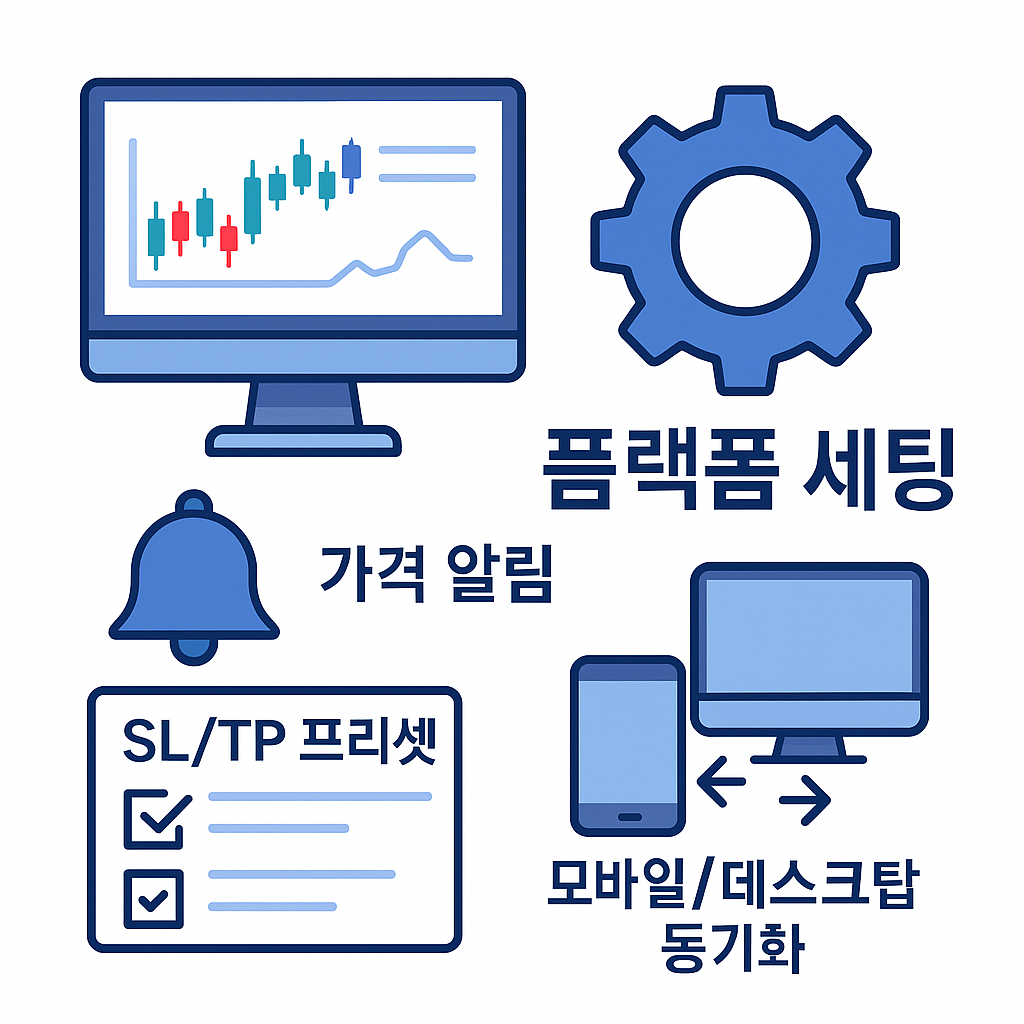 - 기본 세팅 : 호가, 체결창, 알림(가격/시간), 손절, 익절 프리셋, 슬리피지 허용 범위.