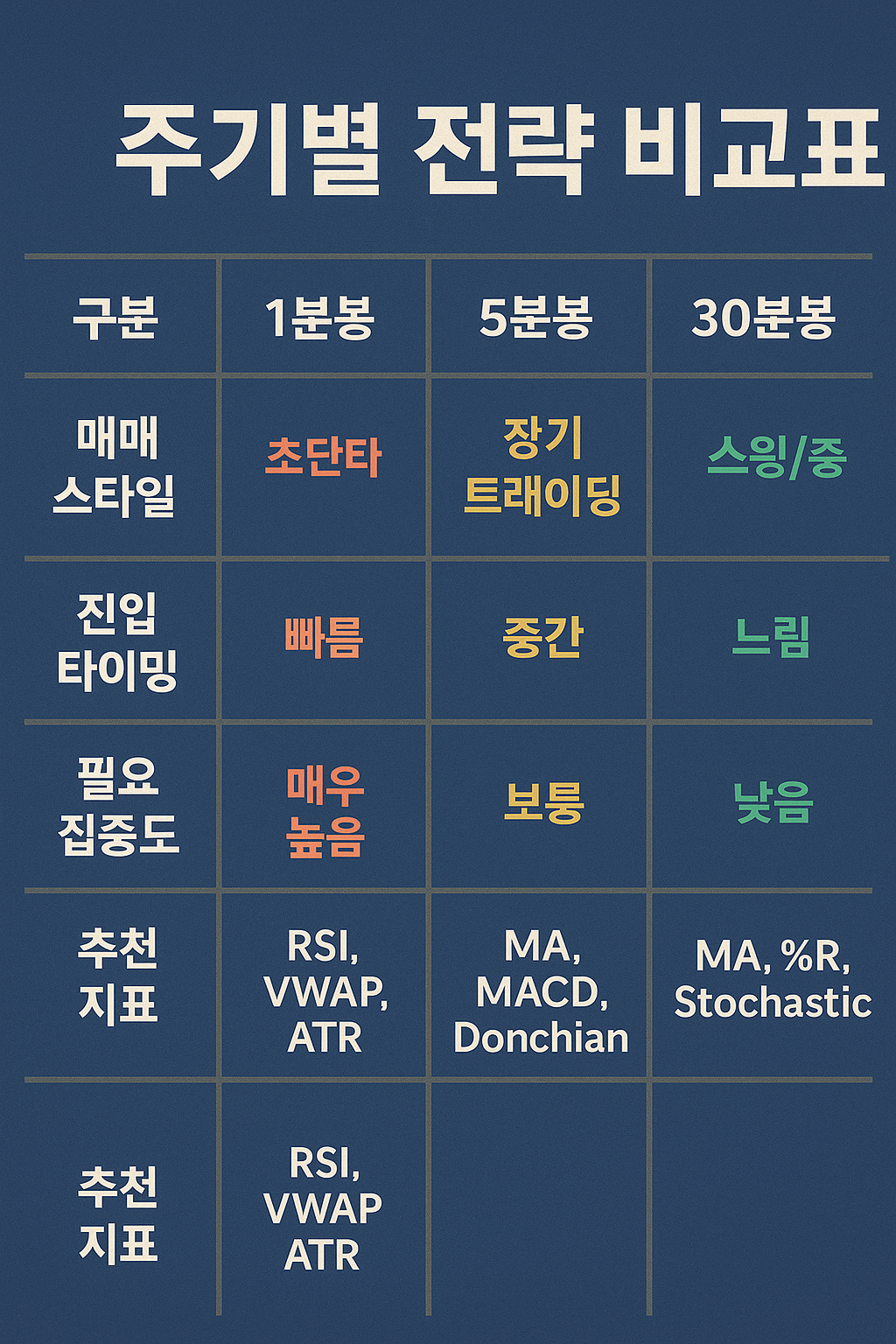 - 예 : 30분 추세 확인 → 5분 진입 타이밍 → 1분 청산 타이밍