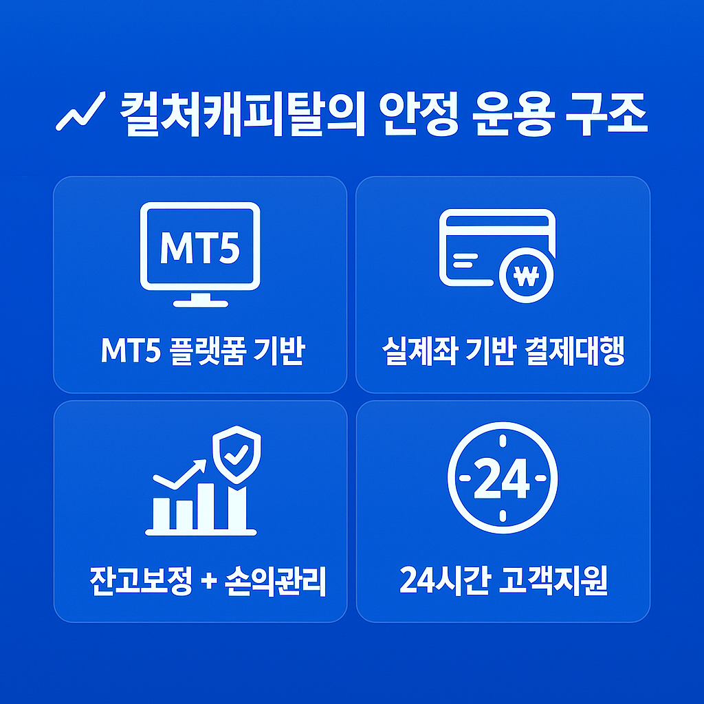 해외선물거래소 '컬쳐캐피탈'의 잔고보정 시스템은 마이너스 리스크를 0으로 만드는 안전운용 솔루션입니다.