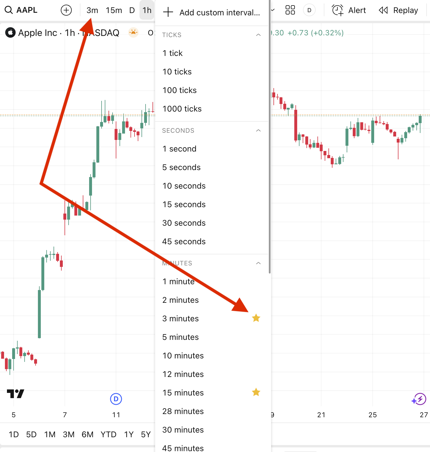 트레이딩뷰 상단의 시간 설정(1분, 5분, 1시간, 일봉)은