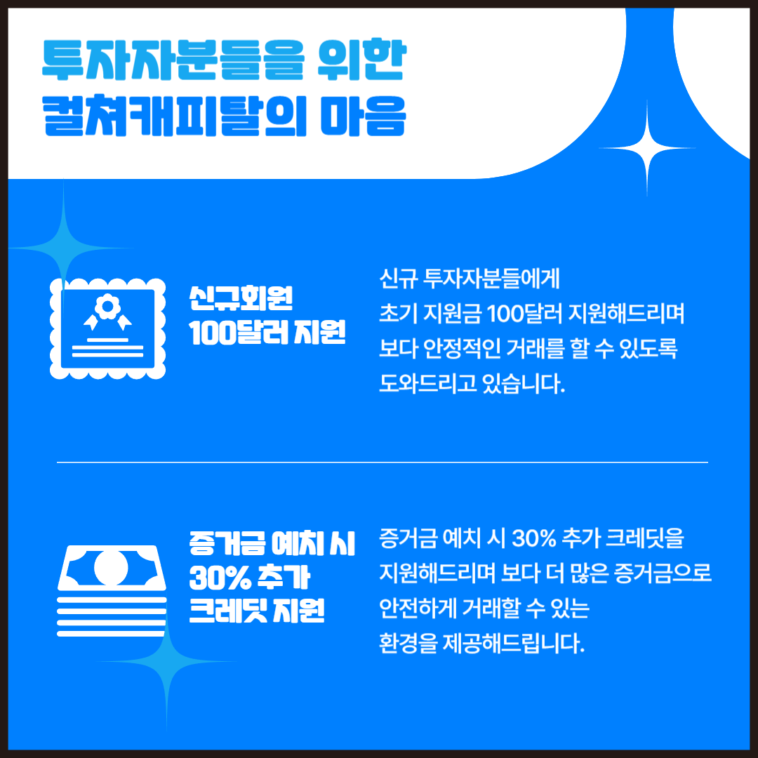 먼저 신규회원분들에게는 100달러를 지원해드리며 초기 증거금을 지원해드리고