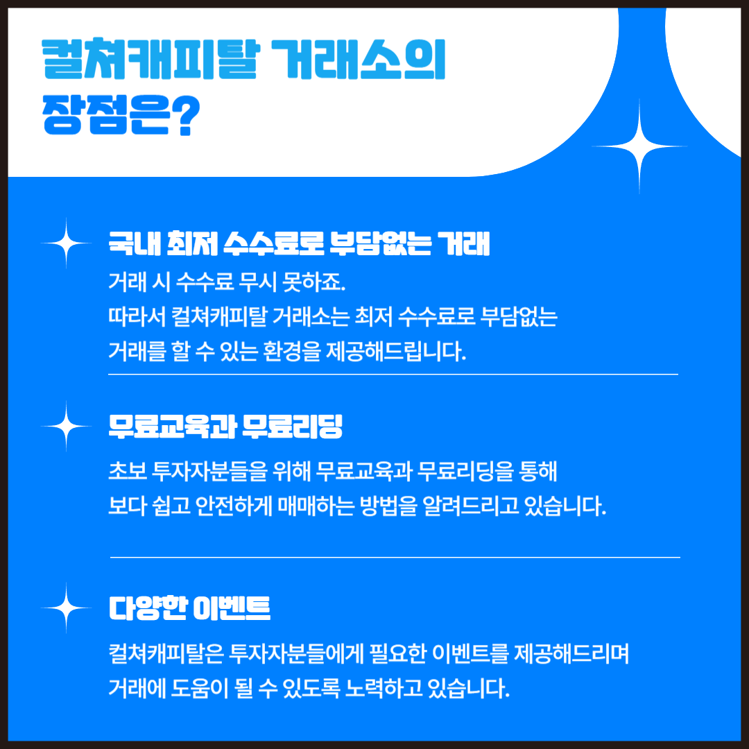 컬쳐캐피탈 거래소의 대표적인 장점은 국내 최저 수수료로 부담없는 거래가 가능하다는 점