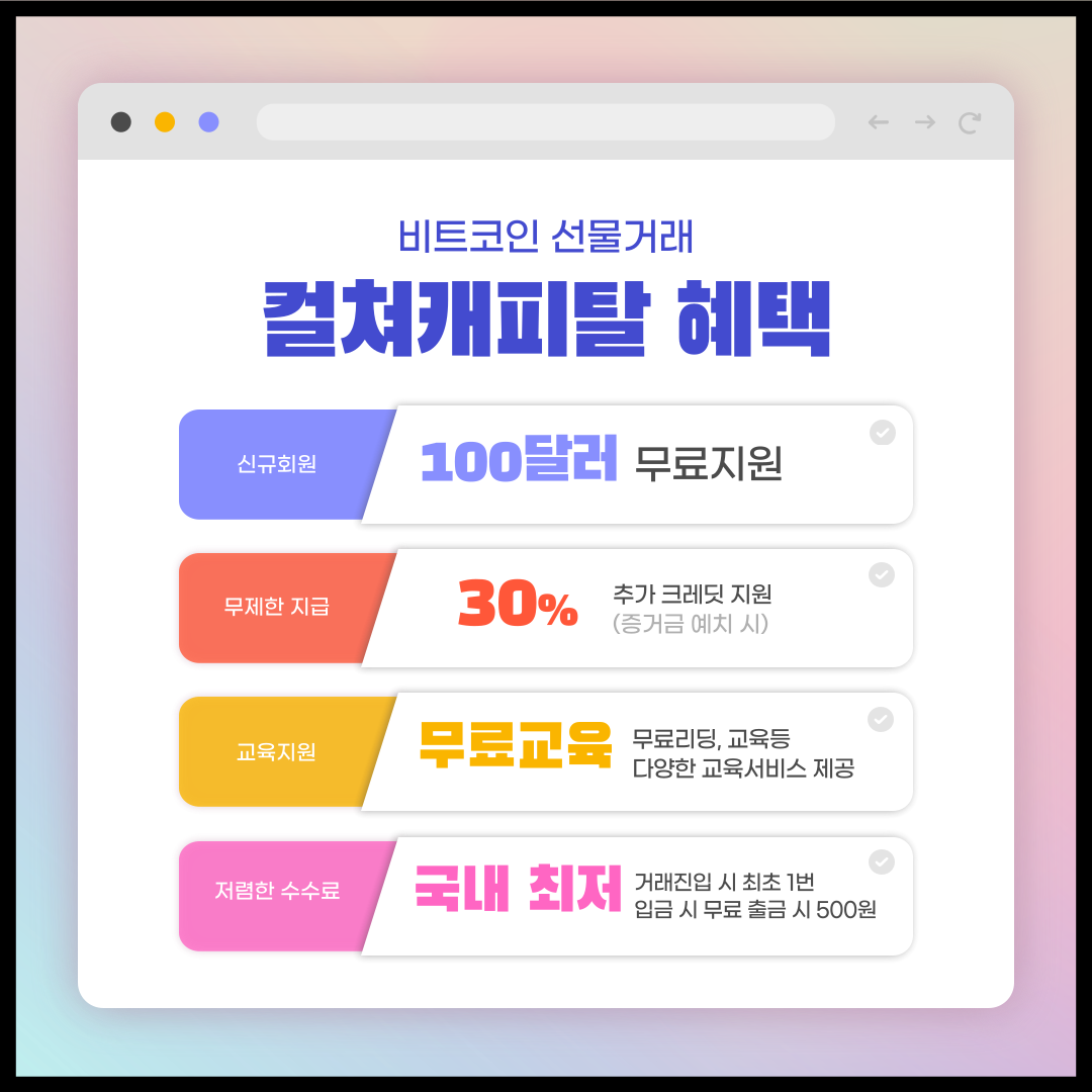 "비트코인 선물거래"를 하시는 컬쳐캐피탈 투자자분들은 더 많은 혜택으로 거래를 할 수 있습니다.