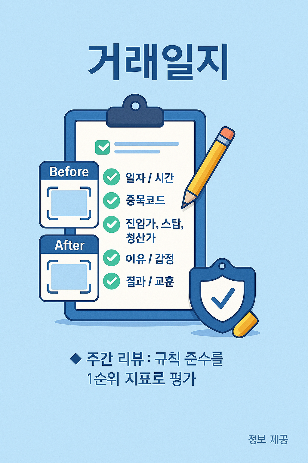 - 계획서 : 종목, 전략(추세/돌파/스윙) 진입, 청산, 리스크 규칙을 한 페이지로